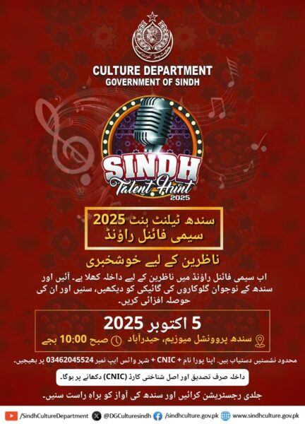 Directorate General Culture – Sindh, Liaquat Memorial Library Near PTV Centre, Stadium Road Karachi.